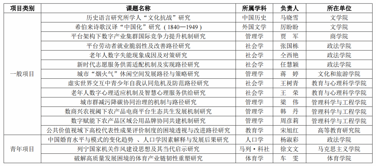 2023年度,我校国家社会科学基金立项课题分属于8个文科学院、科研平台,其中政法学院4项,管理科学与工程学院3项,文学院、教育与心理科学学院各2项,商学院、马克思主义学院、体育学院、文化和旅游学院、高等教育研究院各1项。立项课题分布于7个学科,其中管理学、社会学各5项,教育学、马列·科社、人口学、体育学、外国文学、中国历史各1项。我校社会学学科立项数量排名全国高校并列第1位,管理学学科立项数量排名全国高校并列第7位。